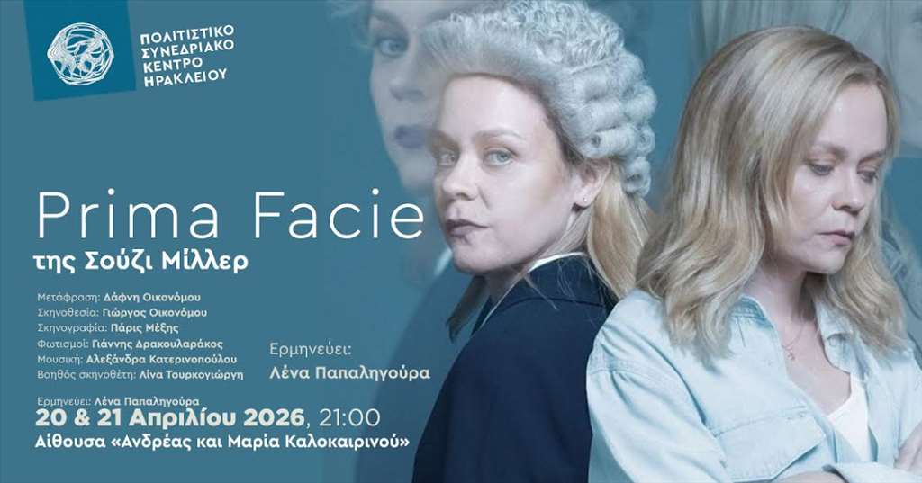 Το ΠΣΚΗ παρουσιάζει τον πολυβραβευμένο θεατρικό μονόλογο της Σούζι Μίλλερ, Prima Facie, με τη Λένα Παπαληγούρα σε σκηνοθεσία του Γιώργου Οικονόμου. Ο διάσημος μονόλογος μετά τα συνεχόμενα sold out στην Αθήνα έρχεται στο Ηράκλειο για δύο παραστάσεις παρουσιάζοντας την ιστορία της Tessa.